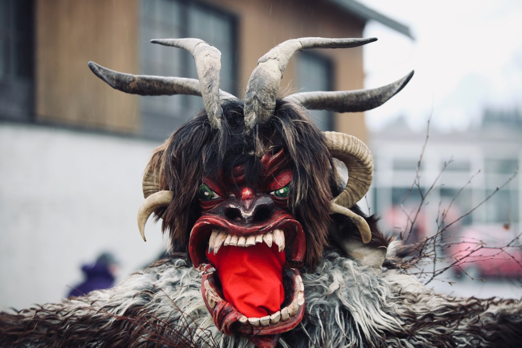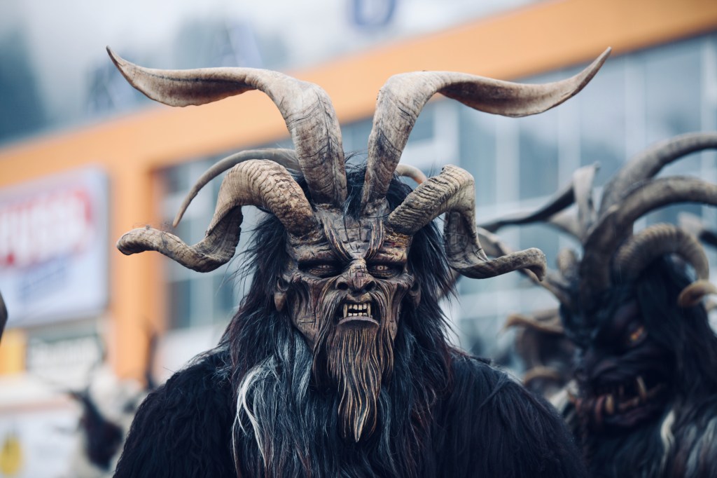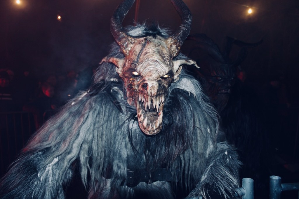 I Krampus (dal bavarese krampn, ovvero “morto”, “putrefatto”, oppure dal termine kramp, che in lingua tedesca significa “artiglio”) sono demoni dalle sembianze mostruose e animalesche, scatenati e molto inquietanti, che si aggirano per le strade alla ricerca dei bambini “cattivi”. I loro volti sono coperti da terrificanti maschere diaboliche, i loro abiti sono laceri, sporchi e consunti. I Krampus, vagando per le vie dei paesi, provocano rumori ottenuti da campanacci o corni, che li accompagnano nel tragitto che compiono, mentre colpiscono con frustate la gente.