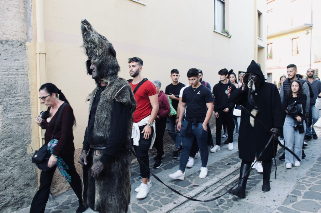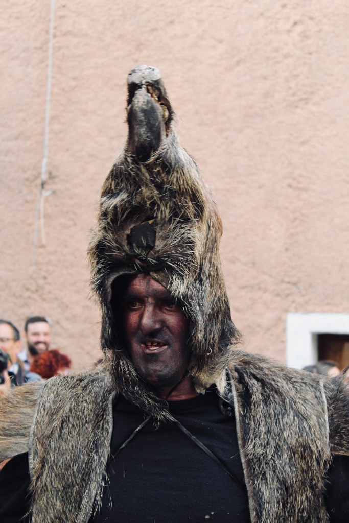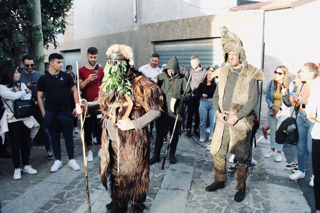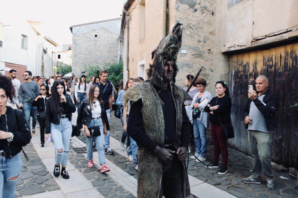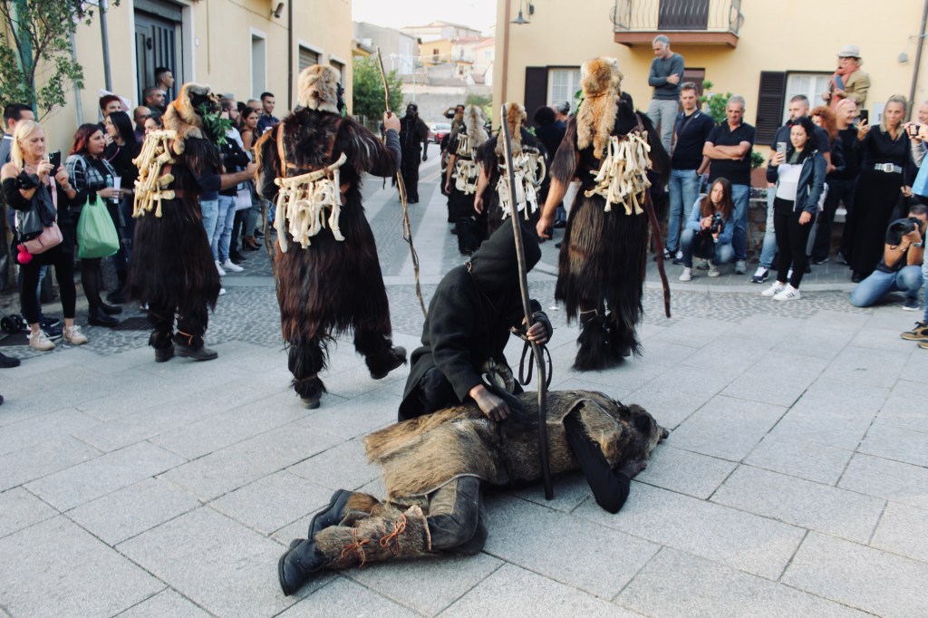 Nella sfilata Il S’Urtzu, animale selvaggio con il costume di pelle di cinghiale, cerca di sfuggire ai Sos Colonganos.