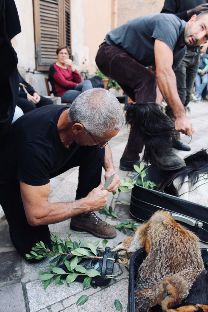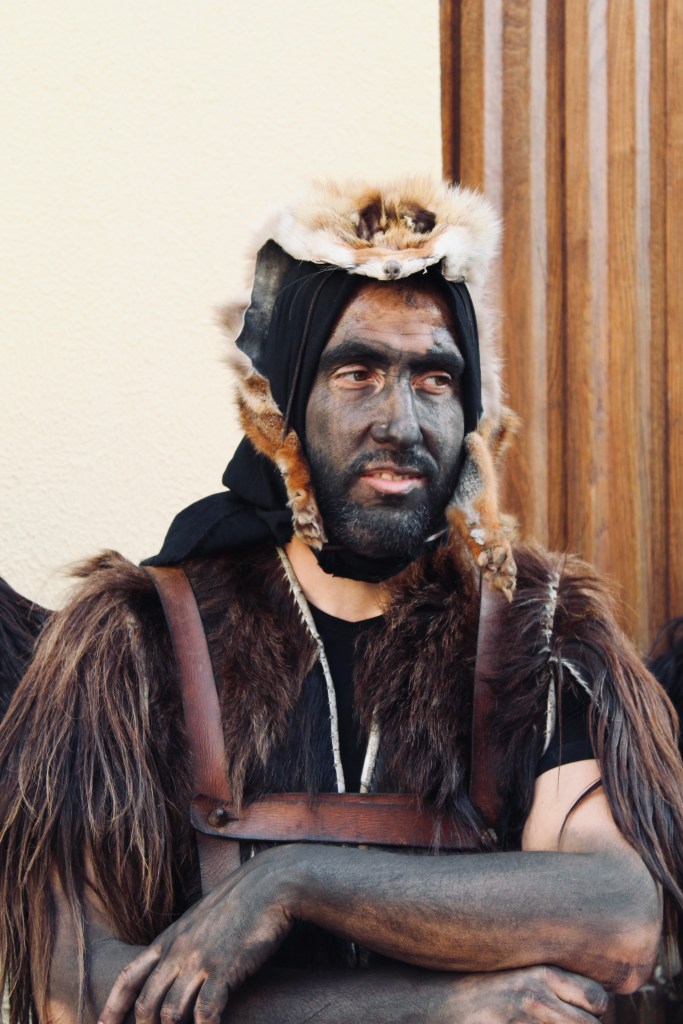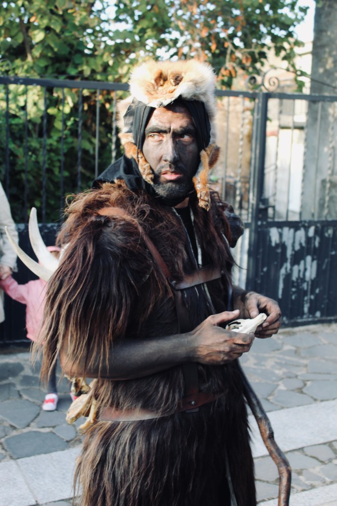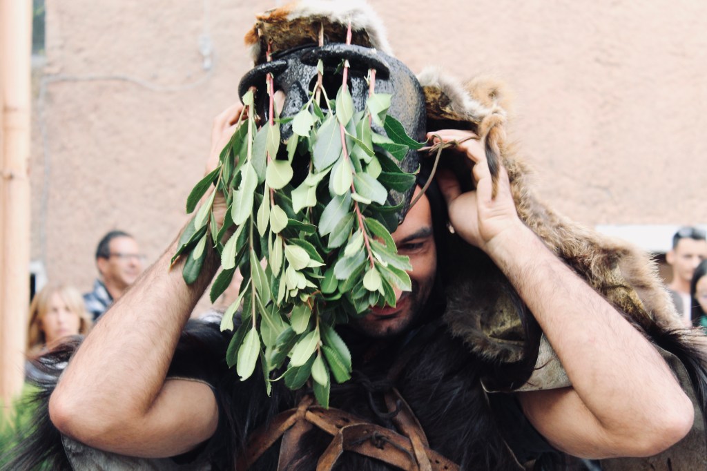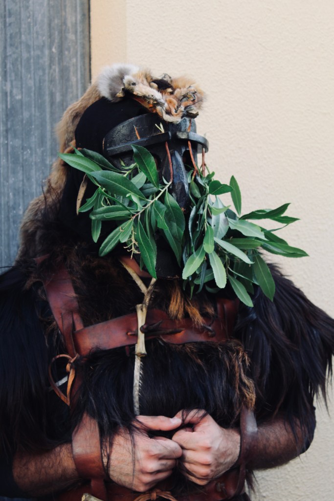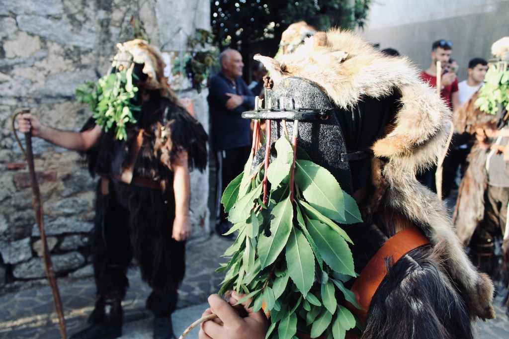 Nella sfilata Il S’Urtzu, animale selvaggio con il costume di pelle di cinghiale, cerca di sfuggire ai Sos Colonganos.