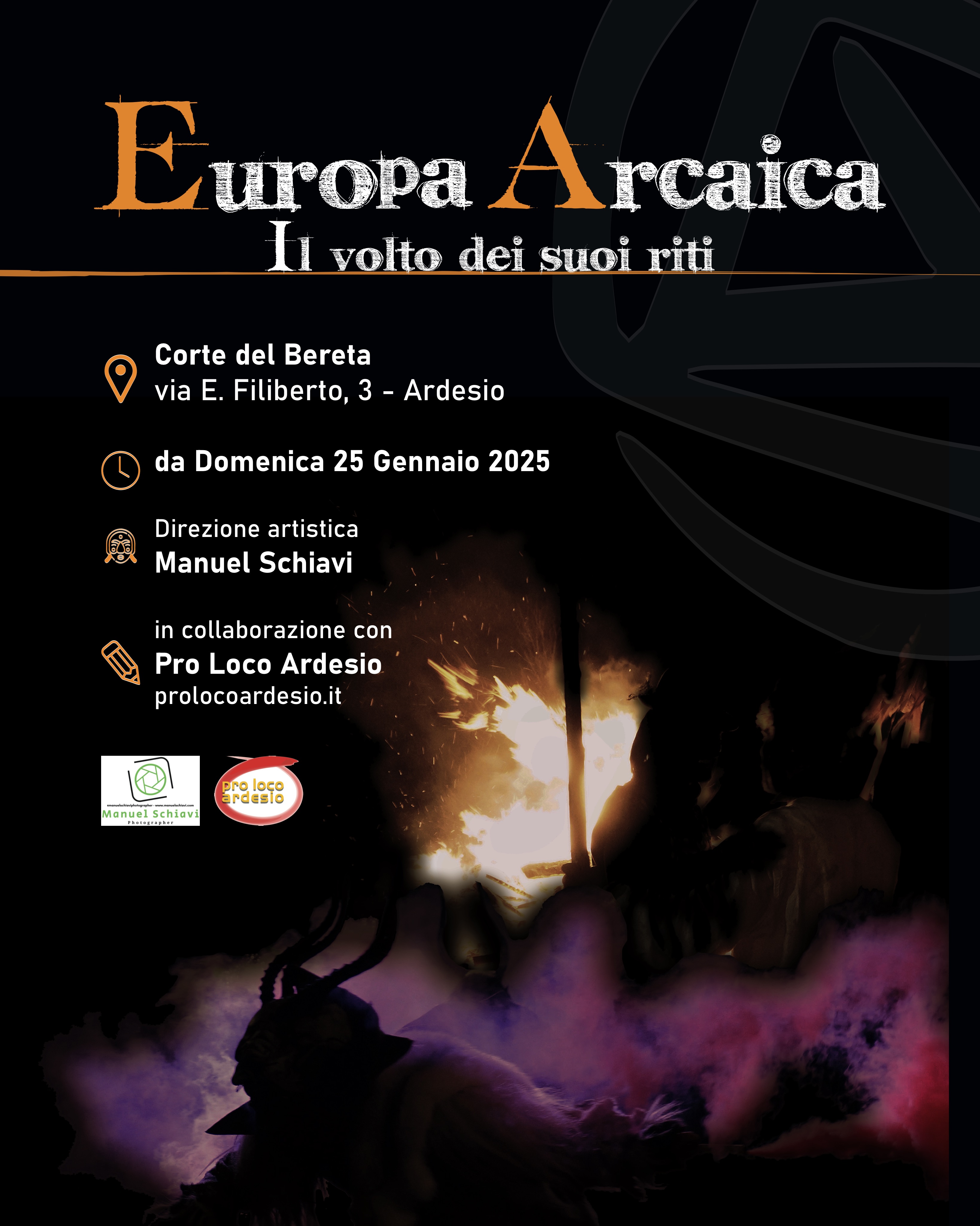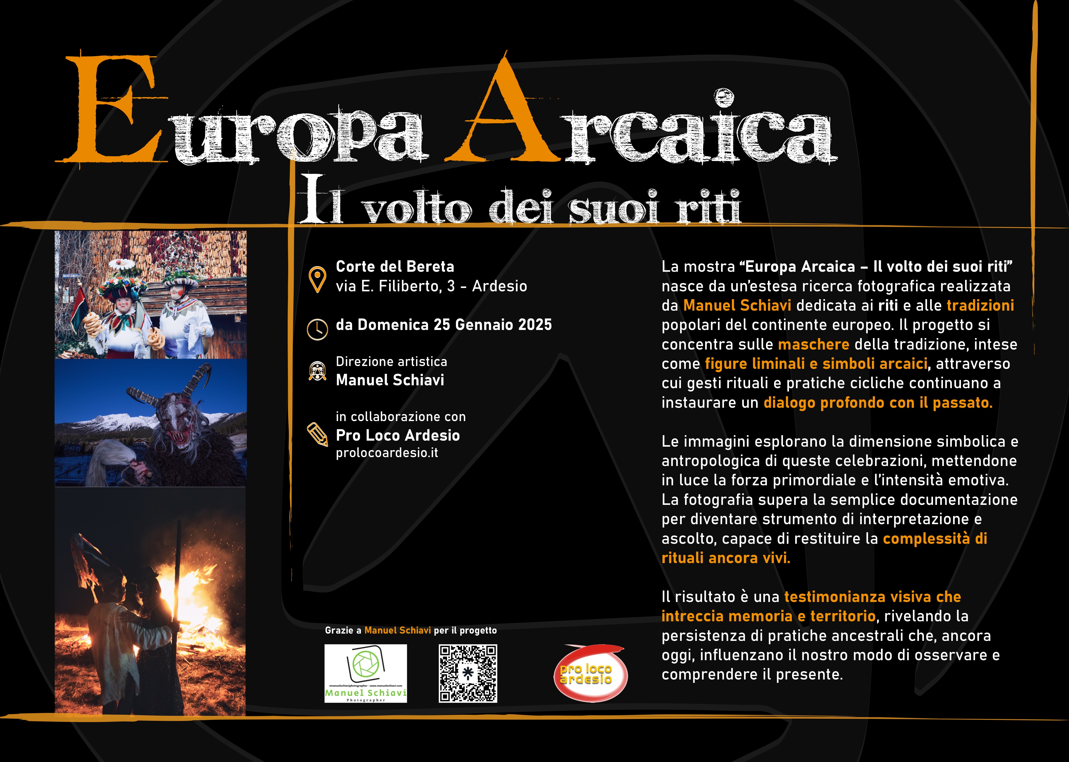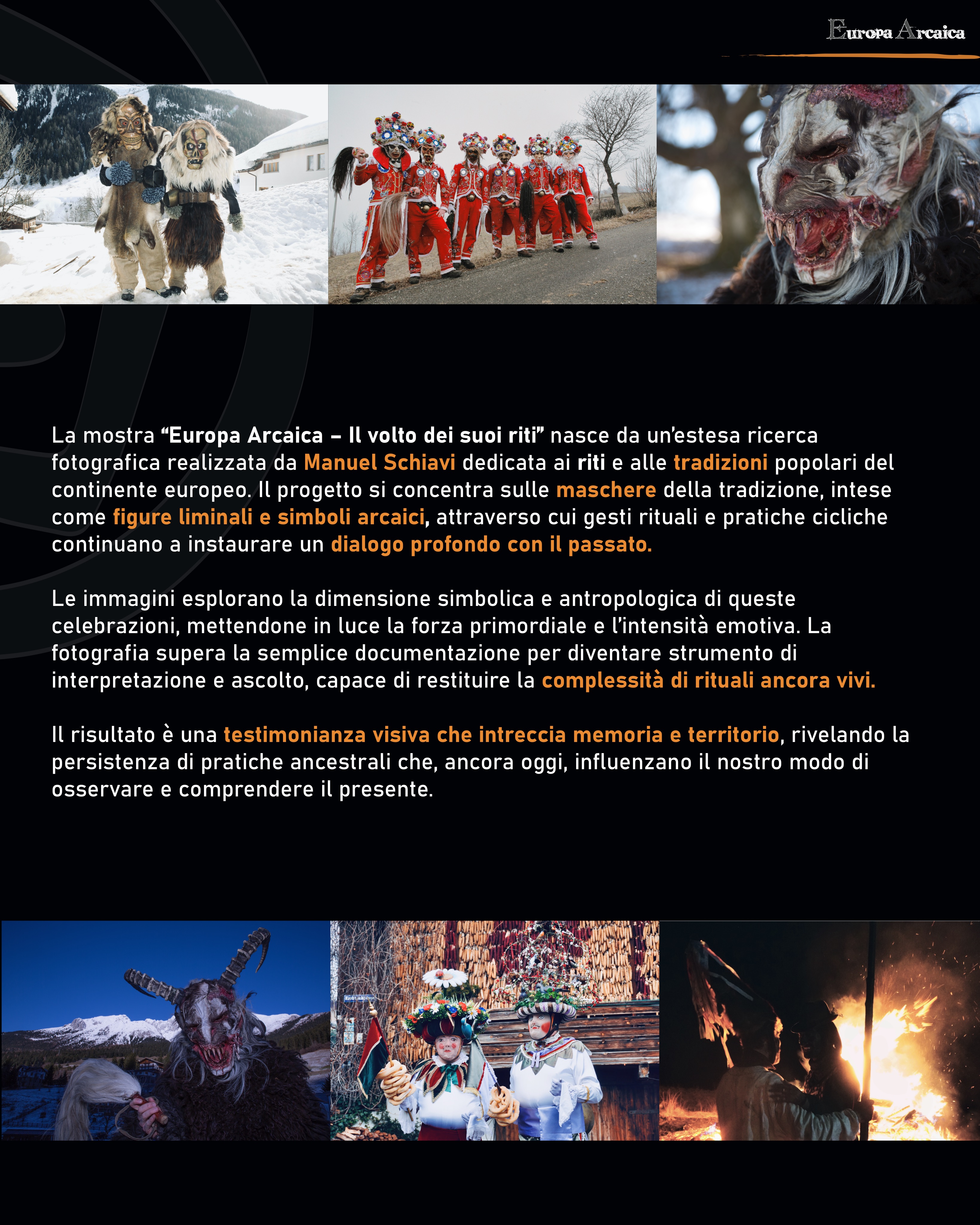 La mostra fotografica di Manuel Schiavi nasce da una lunga ricerca dedicata alle maschere rituali, intese come figure liminali e simboli arcaici, capaci ancora oggi di creare un dialogo potente tra passato e presente.Attraverso immagini intense e suggestive, la fotografia supera la semplice documentazione per farsi ascolto, interpretazione e testimonianza, restituendo la forza primordiale, l’emozione e la complessità di rituali che continuano a vivere nei territori e nelle comunità.